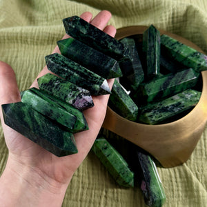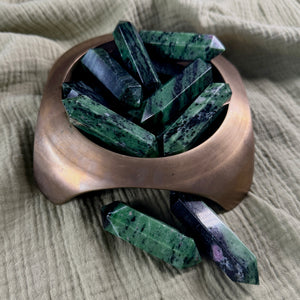 Ruby Zoisite fosters a balanced and harmonious energy flow within the body. It is a great stone for courage, joy, creativity, and healing. Use ruby zoisite for working with the Crown, Third Eye, Heart, and Root Chakras.
